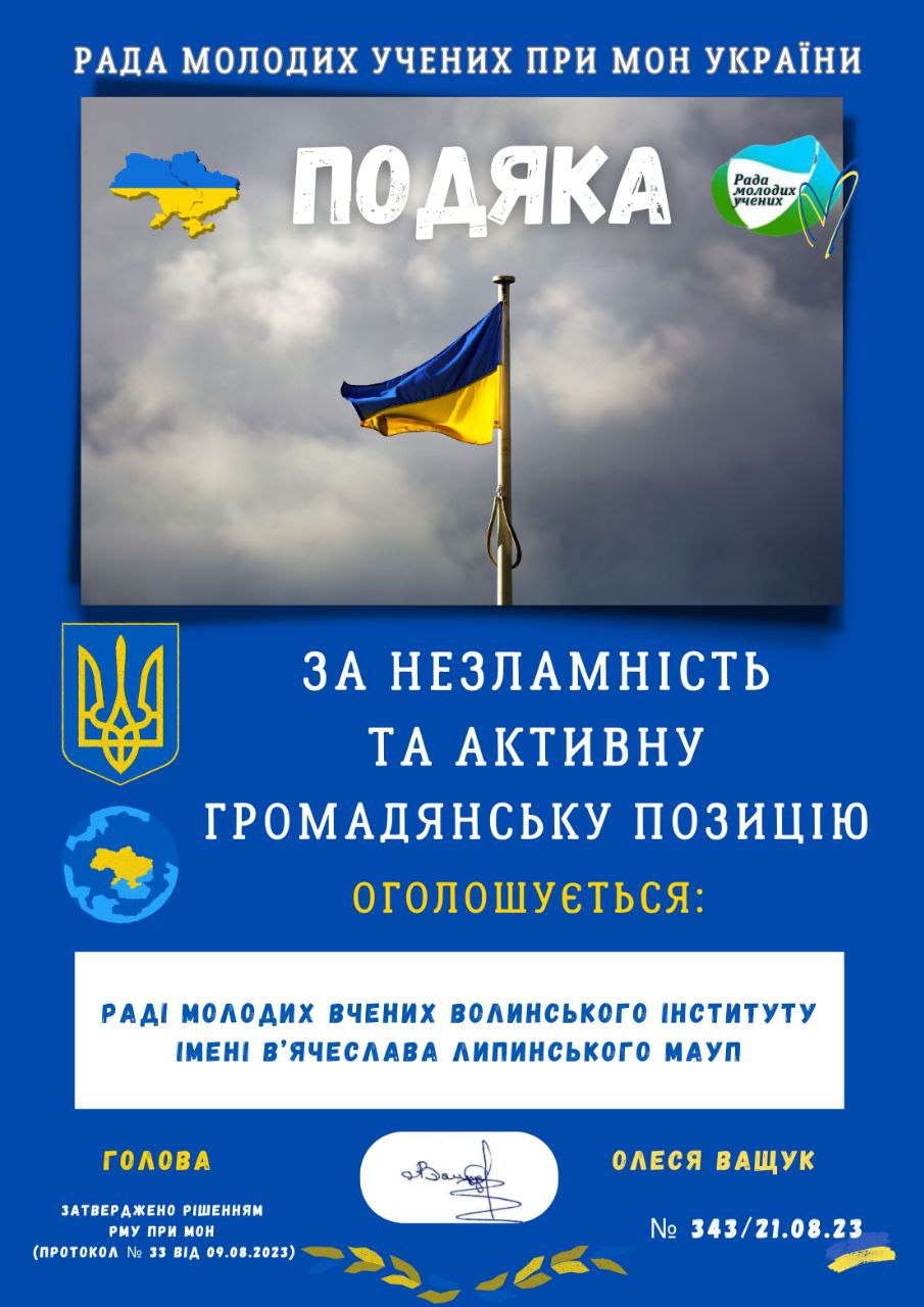 До Дня Незалежності України Рада молодих вчених Волинського інституту імені В’ячеслава Липинського МАУП отримала подяку від Ради молодих вчених при Міністерстві освіти і науки України за незламність та активну громадянську позицію!