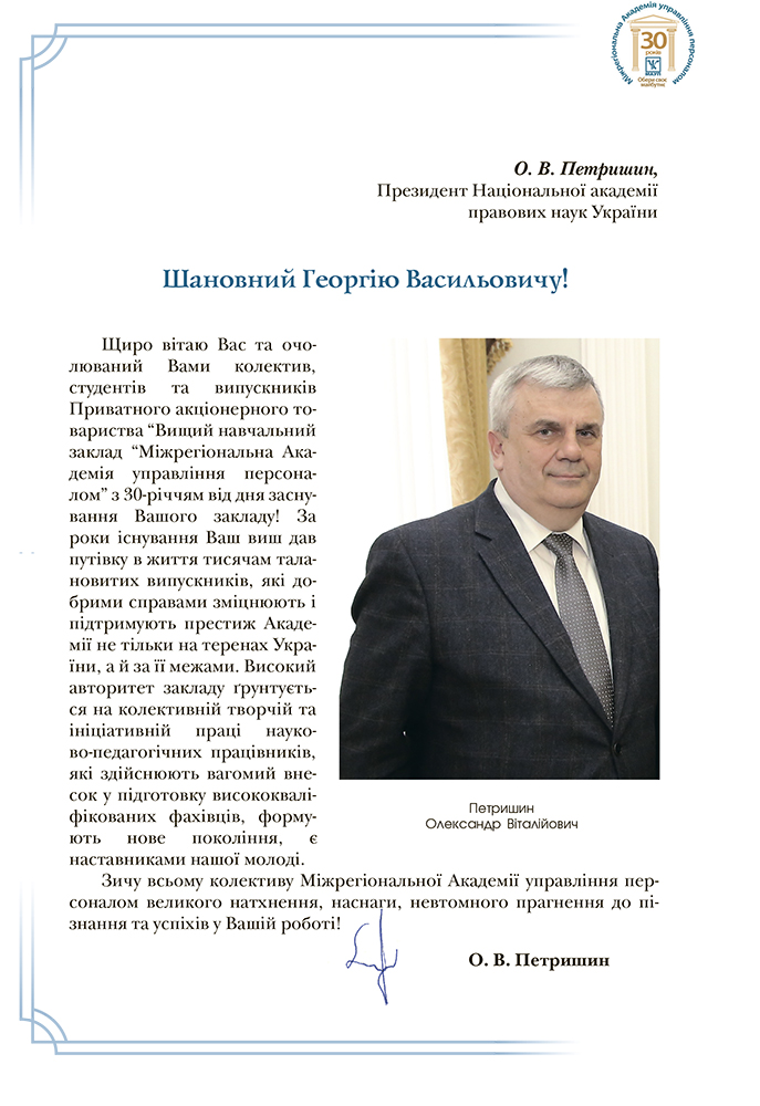 Поздоровлення від Президента Національної академії правових наук України із 30-річчям МАУП