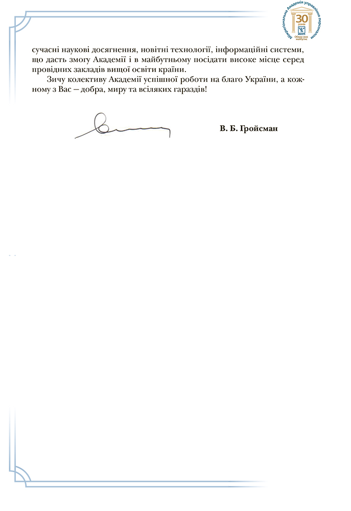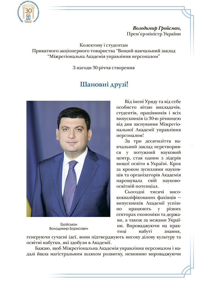 Прем’єр-міністр України Володимир Гройсман привітав МАУП із 30-ю річницею від дня заснування