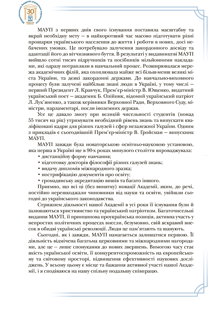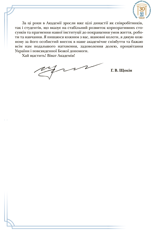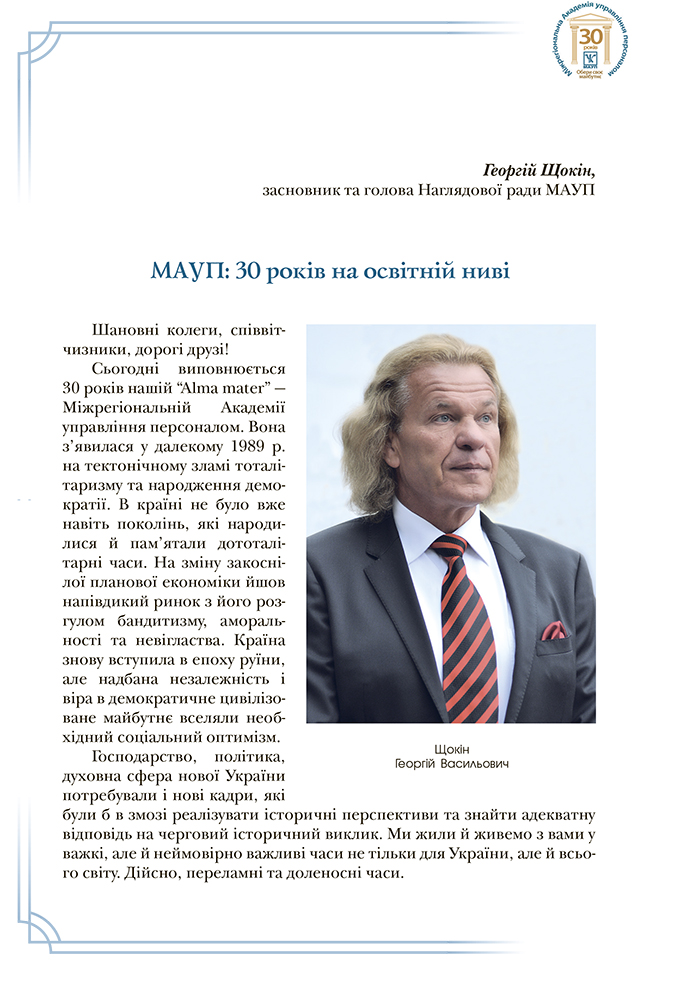 Привітання засновника та голови Наглядової ради МАУП Георгія Щокіна з нагоди 30-річчя МАУП