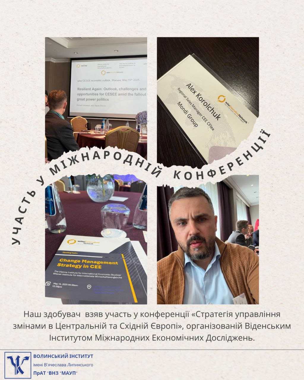 15-го травня наш здобувач 4-го курсу спеціальності D3 Менеджмент Олександр Корольчук взяв участь у конференції «Стратегія управління змінами в Центральній та Східній Європі», організованій Віденським Інститутом Міжнародних Економічних Досліджень. Захід відбувся у Варшаві, і зібрав понад 100 керівників провідних міжнародних компаній, серед яких DHL, Electrolux, Hitachi, Pepco, ING, Toyota, Warner Bros., L'Oréal, Johnson & Johnson, Philips та інші.