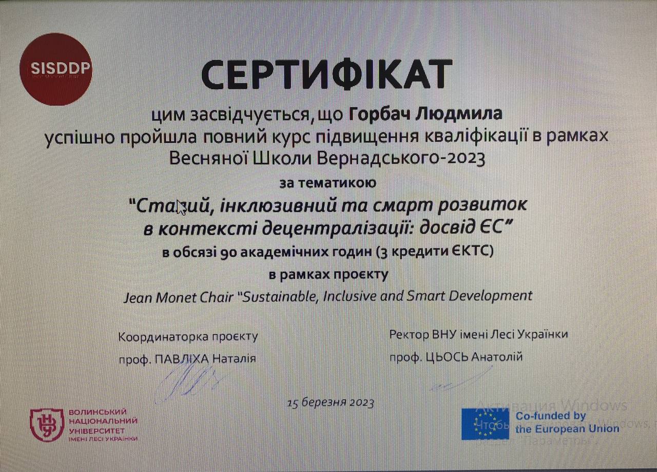 15 березня 2023 р. завершила роботу перша «ВЕСНЯНА ШКОЛА ВЕРНАДСЬКОГО-2023» в межах міжнародного гранту The Jean Monnet Chair project "Sustainable, Inclusive and Smart Development within Decentralization Process: the EU experience" Erasmus +.